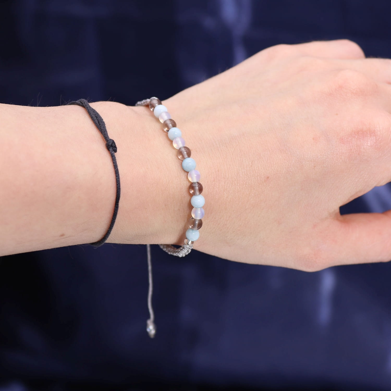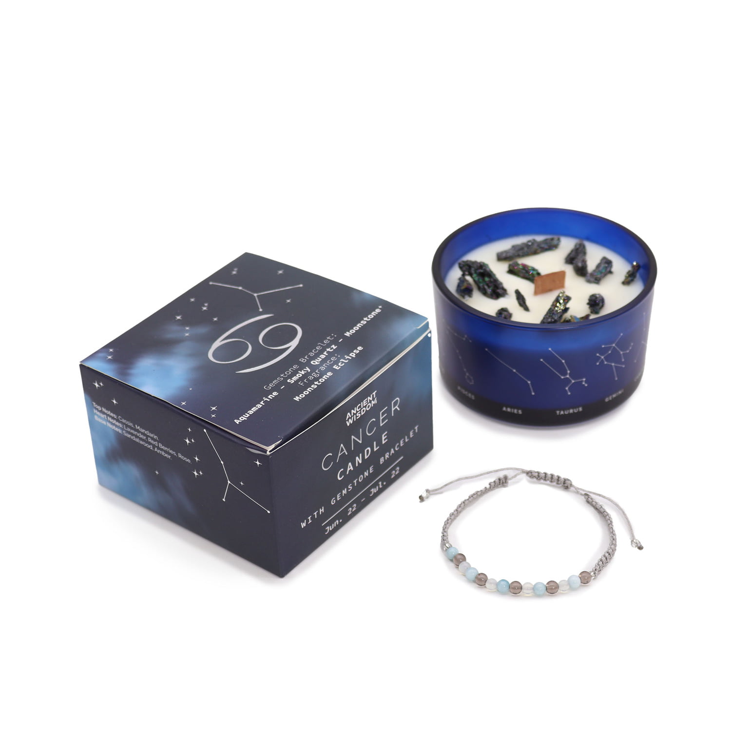 A gyertya mellé egy finom kidolgozású drágakő karkötő tartozik, amely akvamarinból, füstkvarcból és holdkőből áll. Ezek a kövek a Rák érzékenységét és belső erejét támogatják: